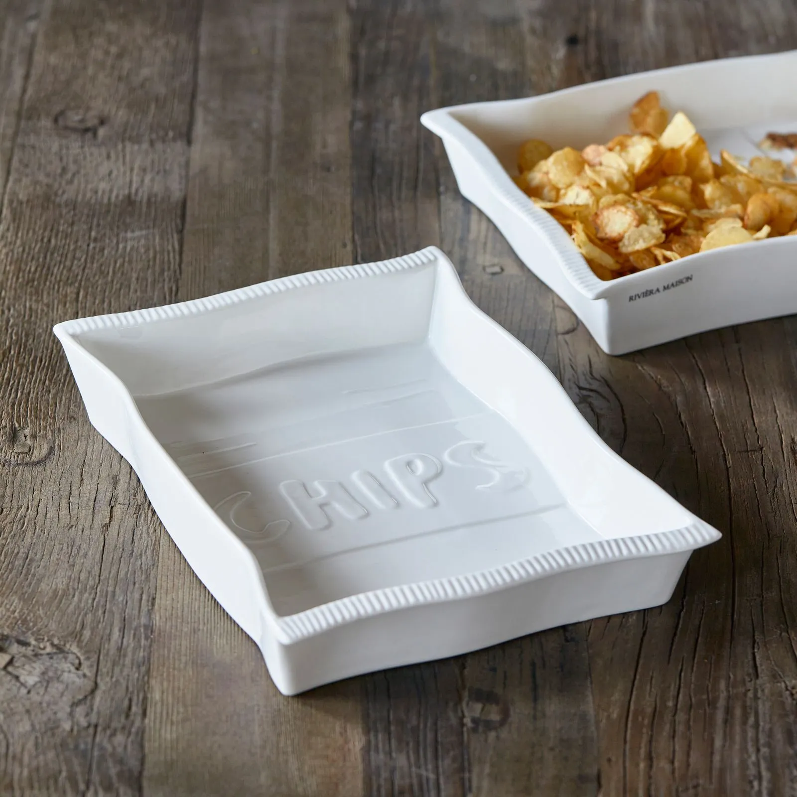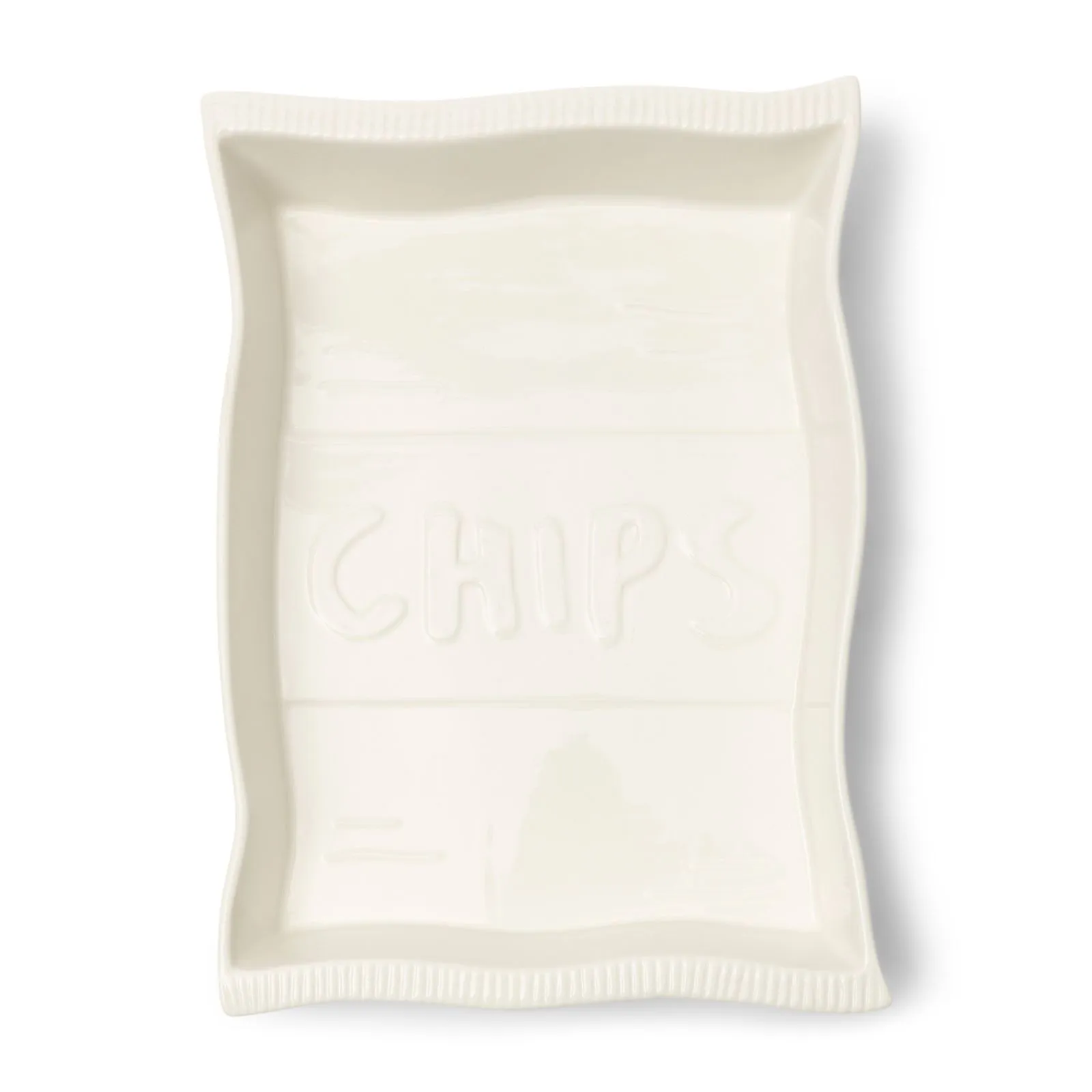 Die RM Loves Chips Schale ist von einer Tüte Chips inspiriert. Rillen im Porzellan oben und unten, die fließenden Linien deuten auf einen ungeöffneten Beutel hin. Auf dem Boden der Schale ist das Wort "Chips" eingeprägt. Die Schale kann in den Ofen gestellt werden, zum Beispiel für Nachos.